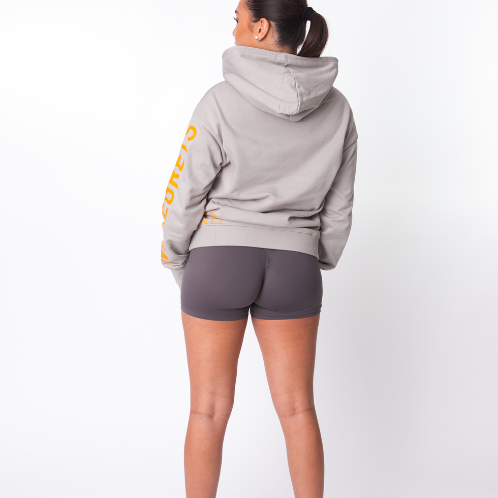 Grey Biker Shorts With A Subtle "CHAOS" Print On The Upper Thigh